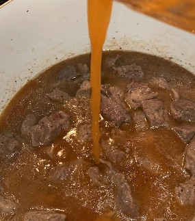 Season your Stew meat with your steak seasoning and Heat pan with oil and minced garlic, add in stew meat- Brown all sides of the meat, drain fat if desired
